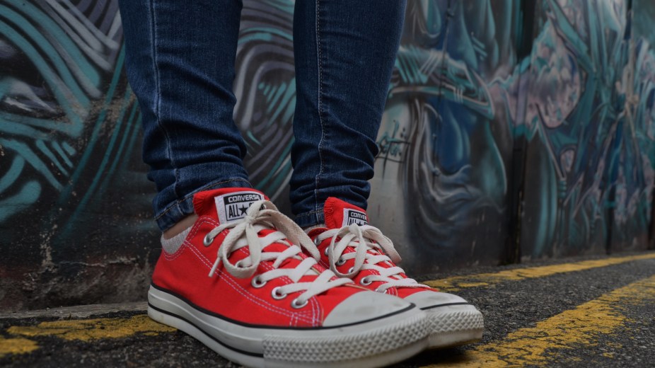 So there are a few visual things that are featured in HISA. Two include walls dividing people and red Converse. Fiona and Danny’s neighborhoods are divided by a “peace wall” that is about thirty feet high. Danny’s side of the wall is covered with graffiti art that was commissioned to beautify the wall. Fiona wears red Converse the entire book. I currently live in Singapore, not Belfast, so we had to find a location that could pass for a wall as described in the book. I bought red Converse to celebrate finishing the latest draft of HISA. So now I’ve officially become an unpaid shoe model as well as a full-time unpaid writer. My friend scouted locations and we found the side of a building on Arab Street covered with artistic graffiti.